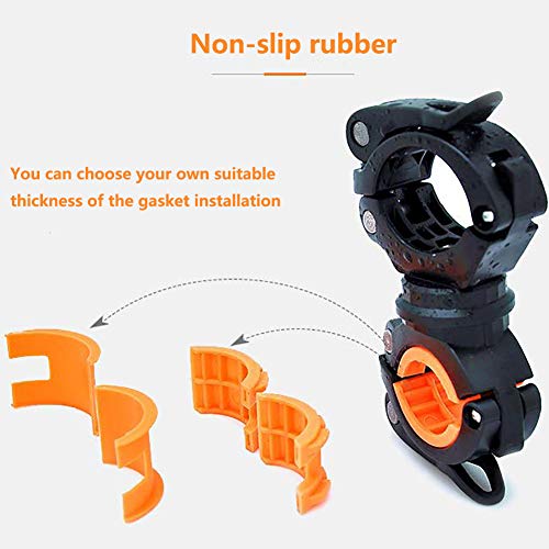 Fonction : le support de lampe de vélo peut fixer la lampe de poche, et le caoutchouc antidérapant de haute qualité de différentes épaisseurs peut non seulement ajuster la taille du clip, mais aussi la lampe de poche et le guidon de vélo contre les rayures.